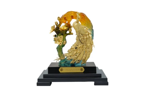 Bring an element of luxury and artistry to your space with this exquisite Peacock Sculpture from Tulja Bhavani Jewellers in Surat. This ornate piece features a detailed peacock perched on a shimmering crystalline branch, accented with luminous blossoms. Set on a sophisticated tiered black base, the sculpture is a magnificent artistic display. The intricate detailing of the peacock’s feathering and the vibrant teal and amber backdrop create a dynamic and elegant statement. This piece is perfect for enhancing your home decor or as a premium spiritual gift, reflecting the fine quality standards of our Jewellery brand in Surat.